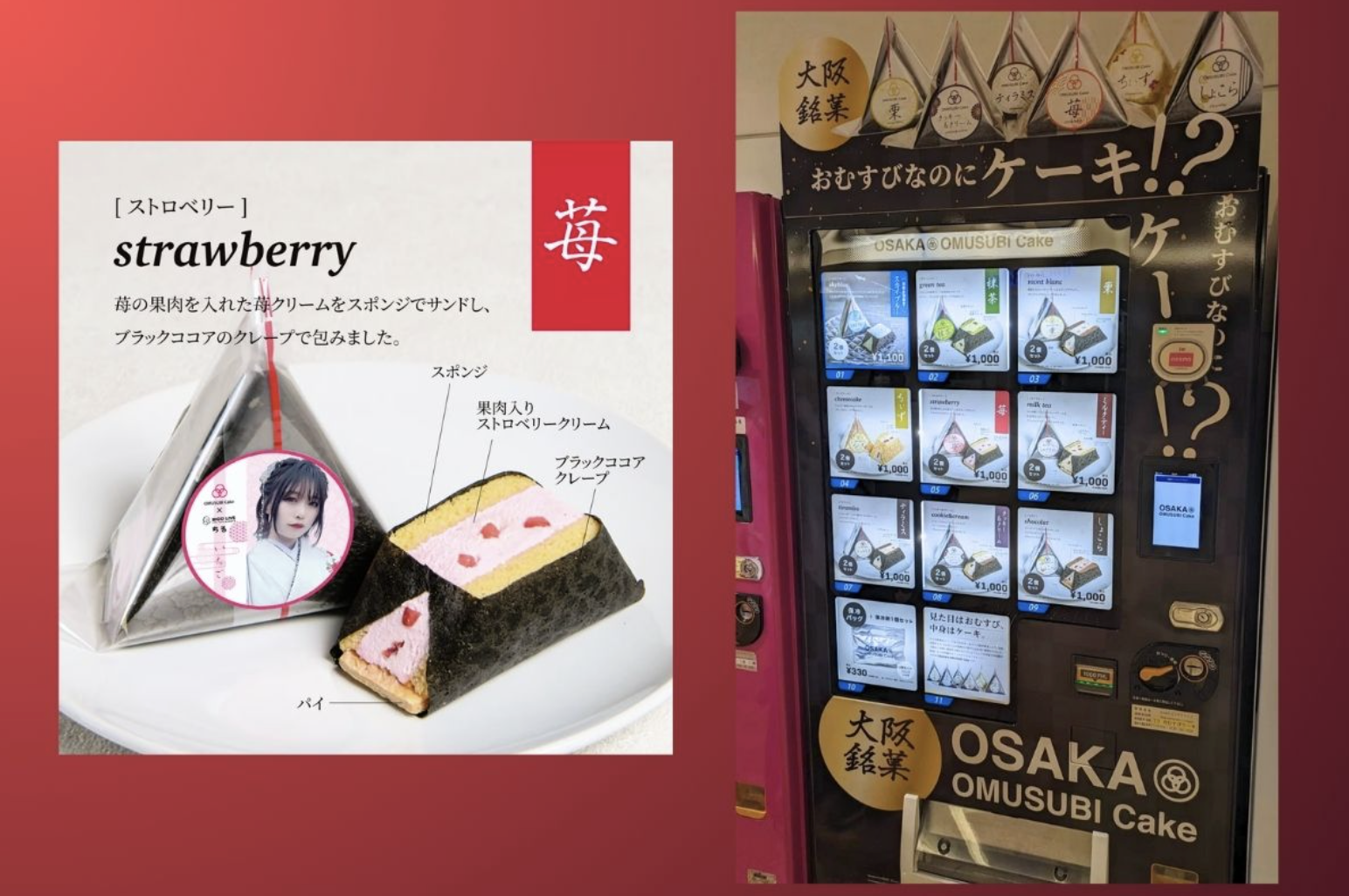 🍙 This fascinating vending machine sells Onigiri-shaped cakes! They look like onigiri, but they are desserts. There are 9 types of cakes to choose from. Very creative!